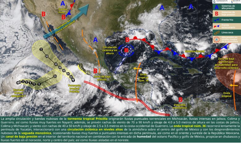 De acuerdo con el pronóstico extendido a 96 horas, la Onda Tropical Número 36, que actualmente recorre la península, interactuará con una circulación ciclónica en niveles altos sobre el centro del Golfo de México, lo que favorecerá lluvias muy fuertes a puntuales intensas (75 a 150 mm) en regiones de Campeche, Yucatán y Quintana Roo, especialmente en sus zonas centro, suroeste y sureste.