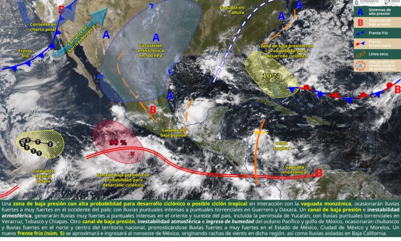Mérida, Yucatán, a 3 de octubre de 2025. – El Servicio Meteorológico Nacional (SMN) ha emitido un pronóstico extendido a 96 horas donde se prevén condiciones meteorológicas severas para la Península de Yucatán, asociadas a la interacción de una zona de baja presión con potencial ciclónico, la vaguada monzónica y canales de baja presión.