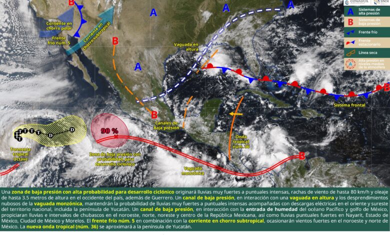 A partir del martes 7 de octubre, el SMN alerta sobre la posible formación de una nueva zona de baja presión con probabilidad de desarrollo ciclónico al sur de las costas de Chiapas y Oaxaca, en el Océano Pacífico. Aunque este sistema se ubicará en el lado opuesto al Atlántico, su interacción con la vaguada monzónica y la onda tropical mantendrá condiciones inestables sobre el sureste mexicano, incluyendo la Península de Yucatán.