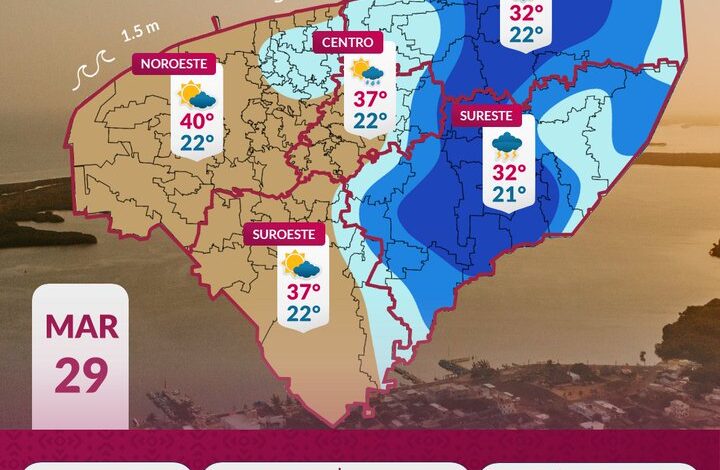 Este sábado 29 de marzo, el ingreso de aire marítimo tropical mantendrá un ambiente muy caluroso en Yucatán. Las temperaturas máximas oscilarán entre 32°C y 40°C en el interior del estado, mientras que en la zona costera se esperan valores de 29°C a 31°C.
