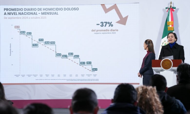 El promedio de homicidio doloso disminuyó 37 por ciento (de 86.9 homicidios diarios a 54.5) a comparación de 2024 a 2025.