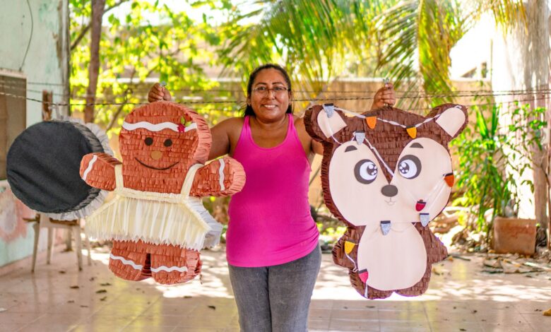 En su taller, entre papel, pegamento y colores, María Concepción Ek Rubio, emprendedora de 45 años y madre autónoma, da forma a piñatas hechas sobre pedido, un oficio que sostiene desde hace cuatro años y que hoy ve con más esperanza.