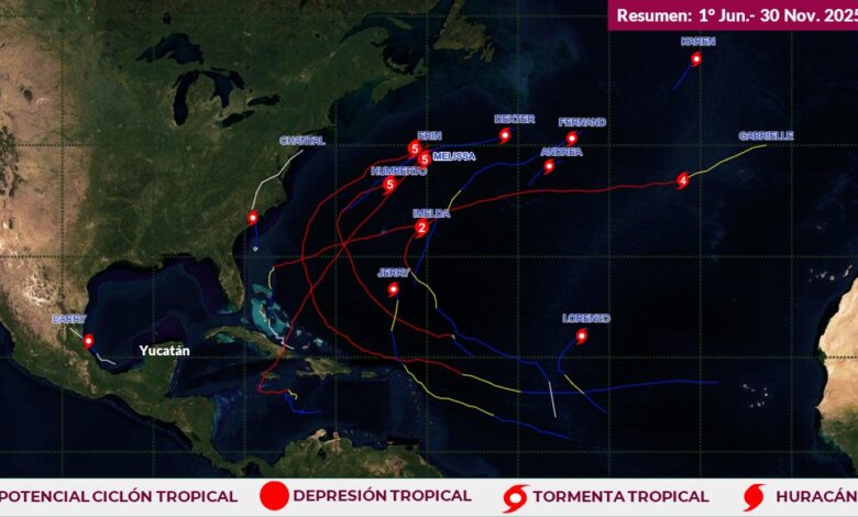 De esos 13 sistemas, cinco alcanzaron la categoría de huracanes intensos: “Erín”, que llegó a categoría 5; “Gabrielle”, categoría 4; “Humberto”, categoría 5, y “Melissa”, que evolucionó de manera súbita a categoría 5; así como “Imelda”, que llegó a huracán categoría 2. Los ocho sistemas restantes se mantuvieron como tormentas tropicales y ninguno afectó de manera directa al estado de Yucatán.