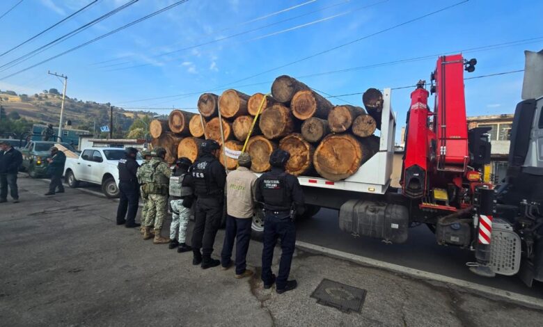 • Decomisan 23 troncos en rollo, 497 piezas de madera aserrada y maquinaria pesada.