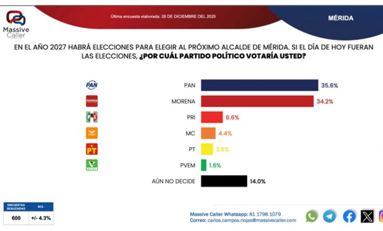Mérida, Yucatán; 29 de diciembre de 2025.- La ventaja que originalmente ostentaba el PAN en la capital yucateca ha quedado reducida a su mínima expresión. Según los datos, el PAN lidera con un 35.6%, pero entra en lo que se percibe como un empate técnico o “tablas” con Morena, que registra un 34.2%. Esta paridad confirma que la “vieja ventaja” panista es ya prácticamente nula frente al avance del partido guinda y otro que resurge.