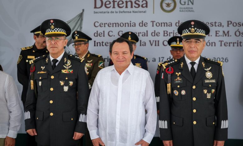 El Gobernador Joaquín Díaz Mena acudió como invitado de honor a la toma de protesta, posesión del cargo y protesta de bandera del general de brigada de Guardia Nacional Estado Mayor, Óscar Rentería Schazarino, como coordinador interino de la VII Coordinación Territorial de la Guardia Nacional.