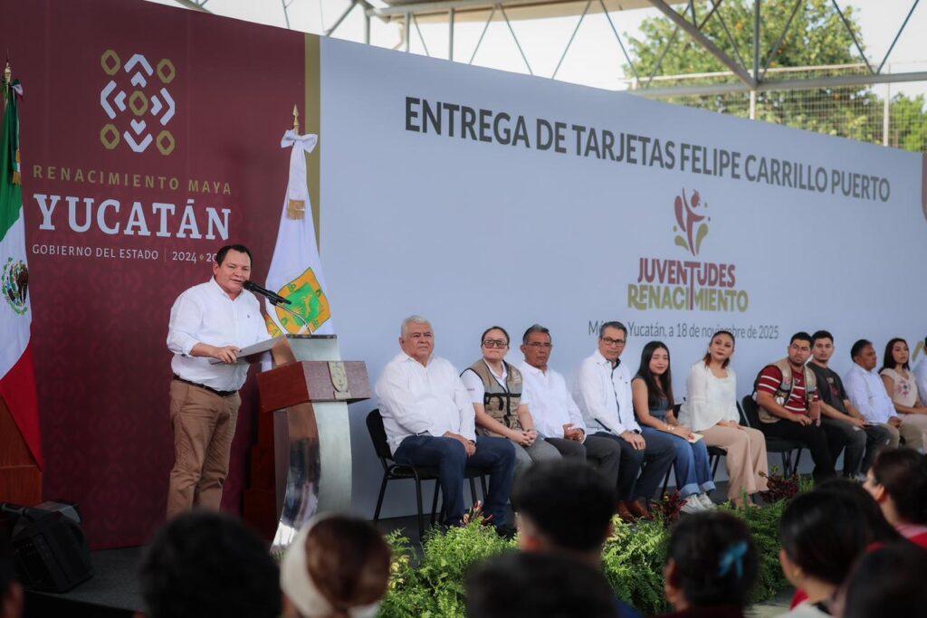 El Gobernador Joaquín Díaz Mena inició esta mañana la entrega de las tarjetas “Felipe Carrillo Puerto”, con las que, en una primera etapa, las y los estudiantes de la Universidad Autónoma de Yucatán (UADY) comenzarán a recibir un apoyo económico de tres mil pesos bimestrales, a fin de que puedan continuar sus estudios y lograr sus objetivos académicos.