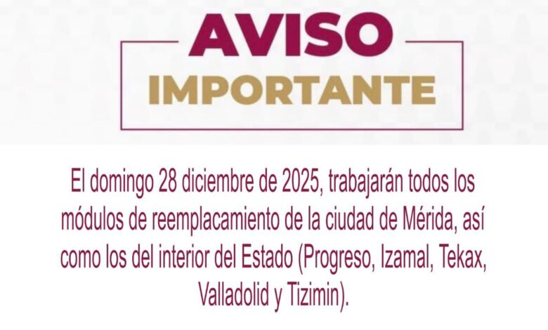 La SAF precisa que los trámites de control vehicular —entre ellos placas, cambio de propietario, introducción de vehículos al estado, reemplacamiento y servicios relacionados— se atenderán este domingo 28 de diciembre, en un horario de 8:00 a 17:00 horas, en todos los módulos de Mérida y en el módulo de Valladolid.