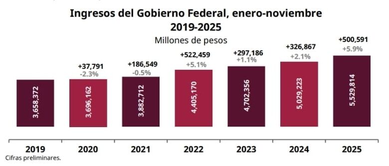El Servicio de Administración Tributaria (SAT) informa que de enero a noviembre de 2025 los ingresos del Gobierno Federal, encabezado por la Presidenta Claudia Sheinbaum Pardo, alcanzaron los 5 billones 529 mil 814 millones de pesos, lo que representa un incremento de 5.9% en términos reales respecto al mismo periodo del año anterior.