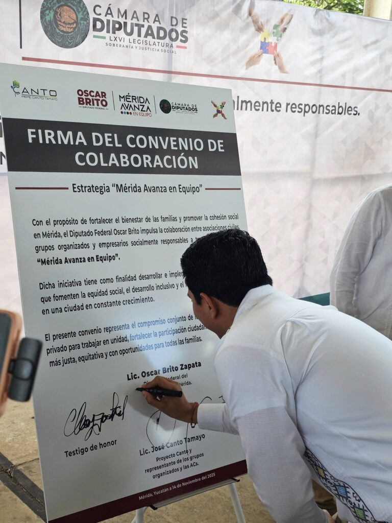 Mérida, Yucatán.— El diputado federal por Mérida y coordinador de la bancada yucateca en la Cámara de Diputados, Óscar Brito Zapata, presentó este día la estrategia de vinculación social “Mérida Avanza en Equipo”, cuyo propósito es fortalecer la participación ciudadana y consolidar una red de alianzas para impulsar proyectos que beneficien a las familias y comunidades del municipio.