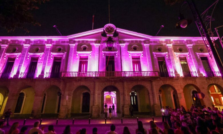 La fachada del Palacio de Gobierno se iluminó de color rosa y sirvió para la proyección del video mapping “Una tradición entre todas” como símbolo de esperanza, unidad y compromiso del Renacimiento Maya ante la lucha contra el cáncer de mama.
