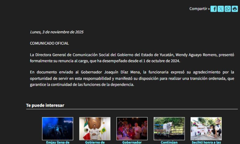 Mérida, Yucatán; 3 de noviembre de 2025.- La licenciada Wendy Aguayo Romero presentó formalmente su renuncia al cargo de Directora General de Comunicación Social del Gobierno del Estado de Yucatán, puesto que ocupaba desde el 1 de octubre de 2024.