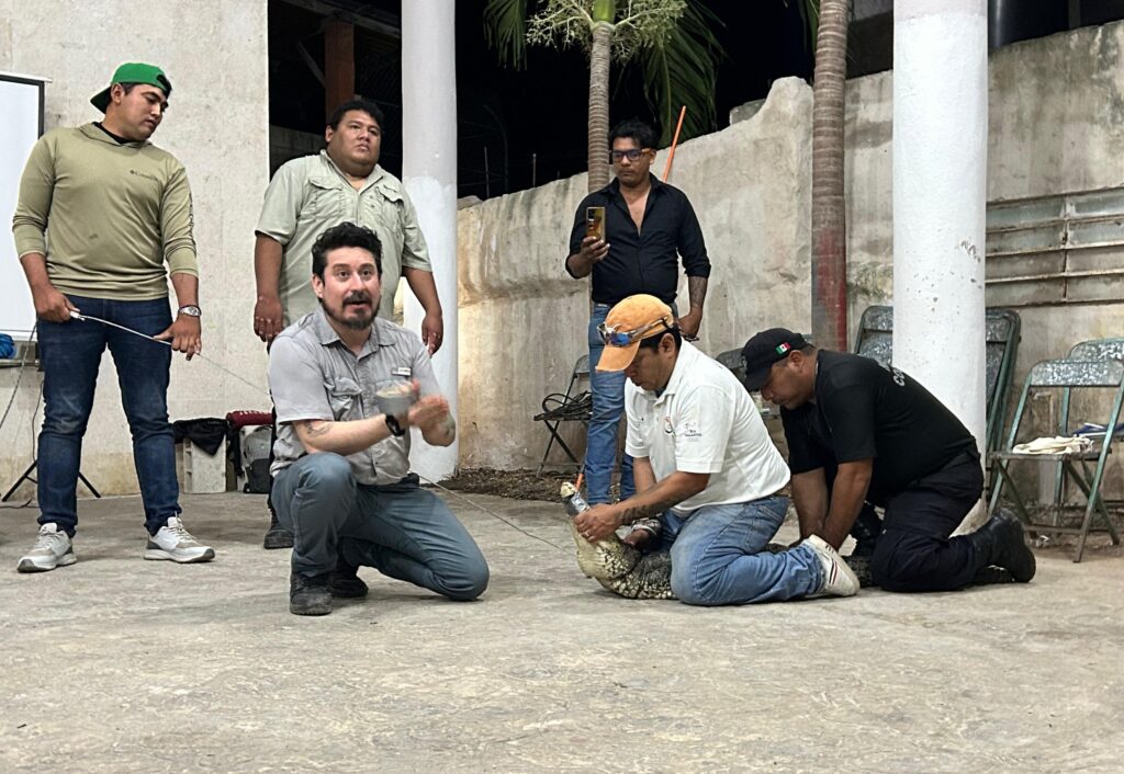 Como parte de la capacitación, se presentó una demostración controlada de manejo con un ejemplar de cocodrilo de la especie moreletii, proveniente de la Unidad de Manejo para la Conservación de la Vida Silvestre (UMA) Itzamkanac de Río Lagartos, con gestiones y acompañamiento del personal de la Conanp.