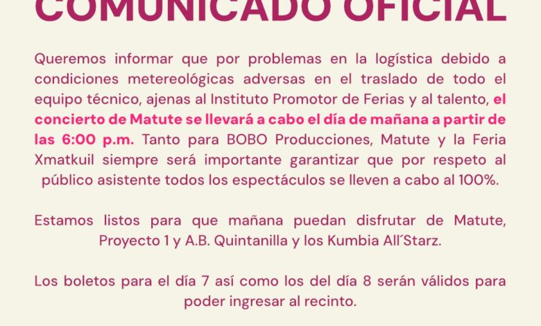 Mérida, Yucatám; 7 de noviembre de 2025.- Esta tarde, se emitió un comunicado por parte de la organización de la Feria Ixmatkuil 2025 para informar sobre el aplazamiento del grupo musical Matute del que no recibimos pormenores previos del mismo, pero que en el presente sabemos que fue programado originalmente para hoy viernes 7 de noviembre.