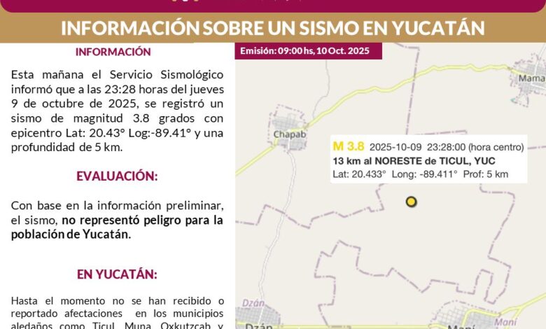 La Coordinación Estatal de Protección Civil informó que el Servicio Sismológico Nacional registró un sismo de magnitud 3.8 con epicentro al noreste de Ticul; el fenómeno fue poco perceptible y no representó riesgo para la ciudadanía.