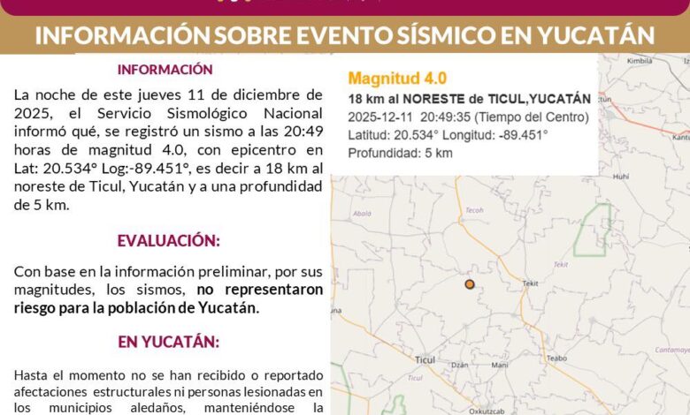 YUCATÁN; 11 DE DICIEMBRE DE 2025.- La noche de este jueves, nuestro estado experimentó nuevamente un evento sísmico. El Servicio Sismológico Nacional (SSN) dio a conocer sobre el registro de un nuevo temblor a las 20:49 horas, (Hora del centro del país) de 4.0 de magnitud.